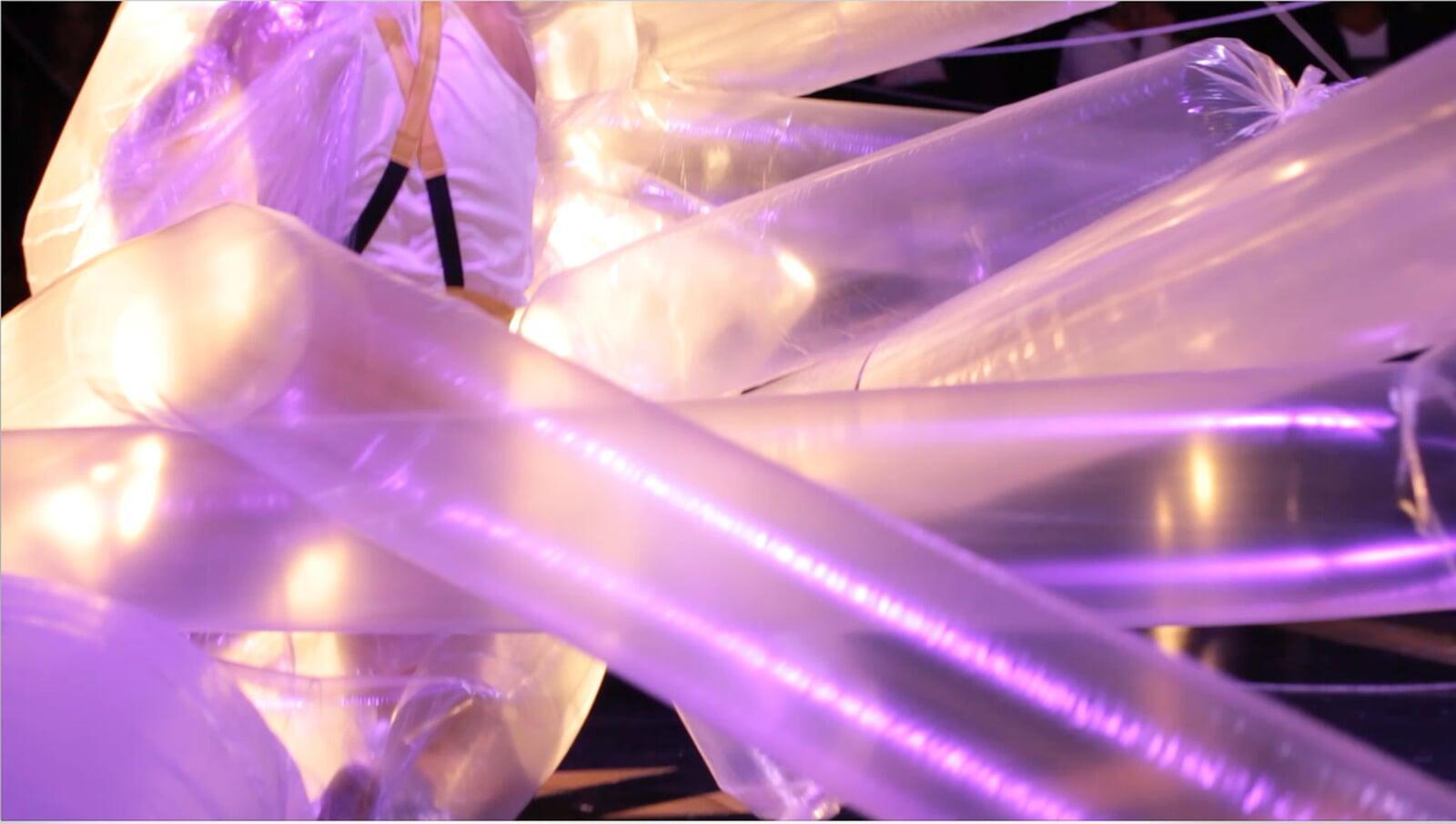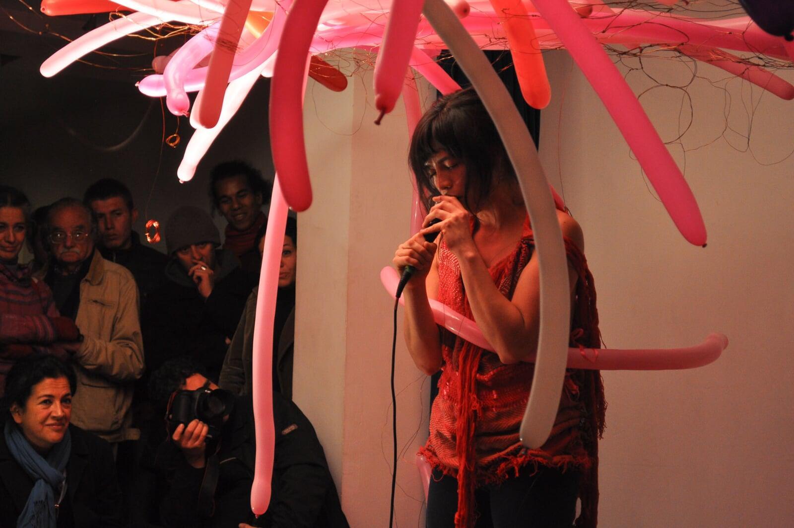 The performer touches and breaks portions of the web, provoking a subtle noise that progressively becomes a concert for noise. Everything concludes with a song in which the performer’s voice transitions from a lyrical and sweet tone to guttural screaming. The delicate actions experienced at the beginning are transformed into an event where all elements (her voice, the concert, the installation, and the space) collapse because of vibration.