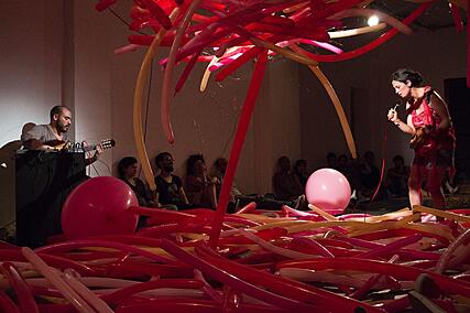 Vocal Bucal is an open experiment that looks to bring sound to its material substance. It is a scrutiny of fragility from diverse angles: the fragility of technology, communication, and language. The performance takes place inside a large spider web made of knitted Copper wire, a sound installation that responds sonically to touch.